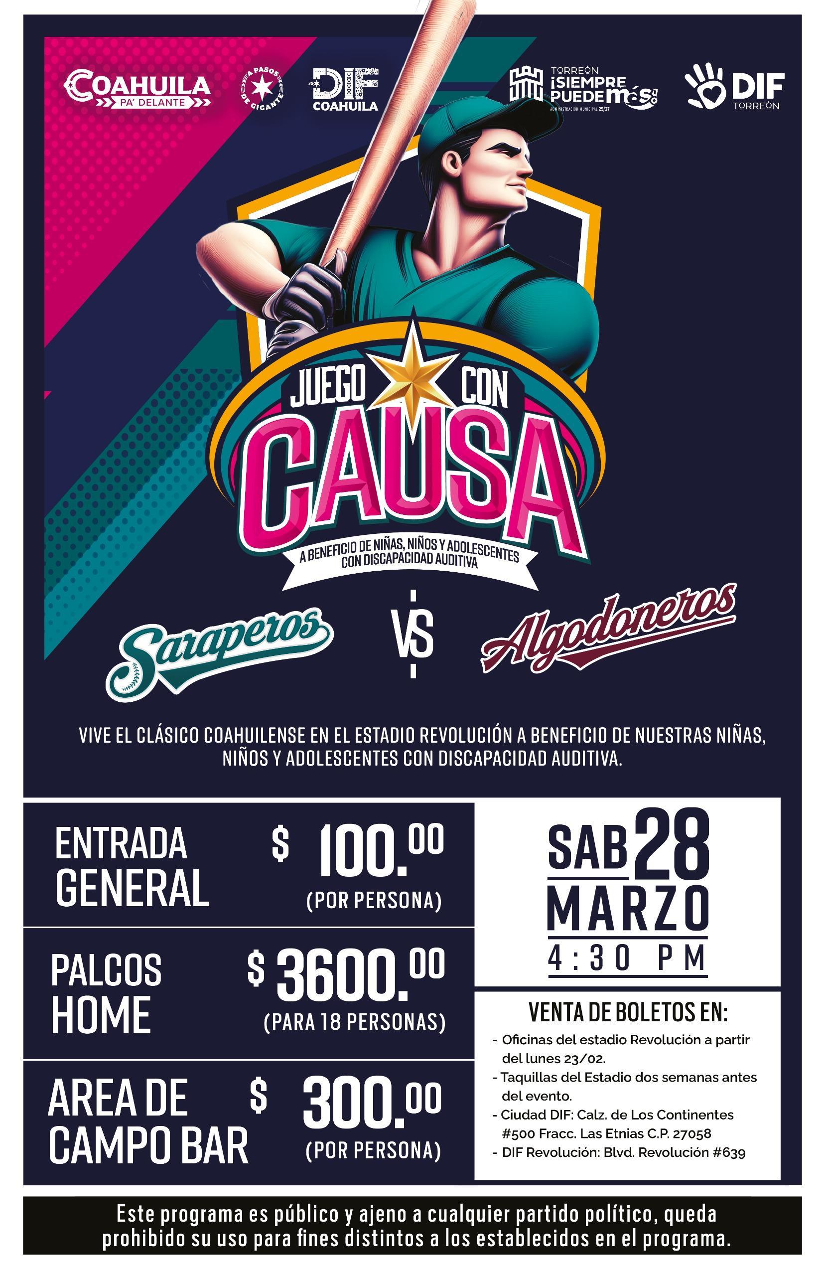 Torreón, Coahuila.- El Sistema para el Desarrollo Integral de la Familia (DIF) Torreón anunció la realización de un juego con causa entre los equipos Saraperos de Saltillo y Algodoneros Unión Laguna, cuyo objetivo será recaudar recursos para apoyar a niñas, niños y adolescentes con discapacidad auditiva.