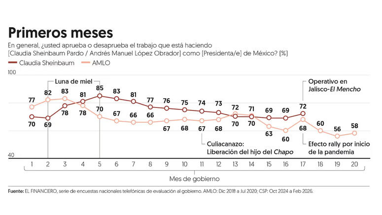 El repunte en la aprobación a Sheinbaum vino en el mes 17 de gobierno, tras el operativo en Jalisco para detener a El Mencho, el pasado domingo 22 de febrero.