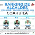 Torreón, Coahuila. — El alcalde de Torreón, Román Alberto Cepeda González, se colocó como el presidente municipal con mayor respaldo ciudadano en el estado, de acuerdo con la más reciente medición correspondiente a marzo de 2026, al alcanzar una aprobación del 67.4%. El resultado posiciona al edil lagunero en el primer sitio del ranking estatal, … Leer más