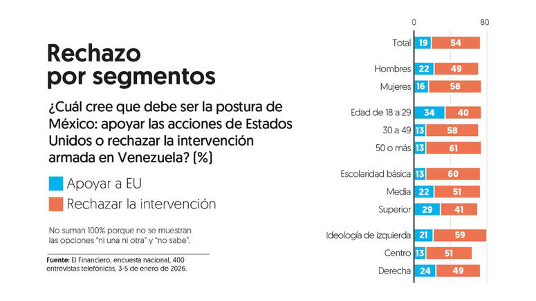 Por lo pronto, la encuesta de EL FINANCIERO sobre las acciones militares en Venezuela, publicada el martes pasado, reveló que la mayoría de la opinión pública mexicana no vio justificación en lo sucedido y expresó un rechazo a la intervención de Estados Unidos en el país sudamericano.