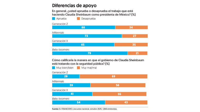 La encuesta nacional de octubre arroja una aprobación a la presidenta Sheinbaum de 70 por ciento. Si se desagregan los niveles de aprobación por grupos generacionales, se observan diferencias muy interesantes.