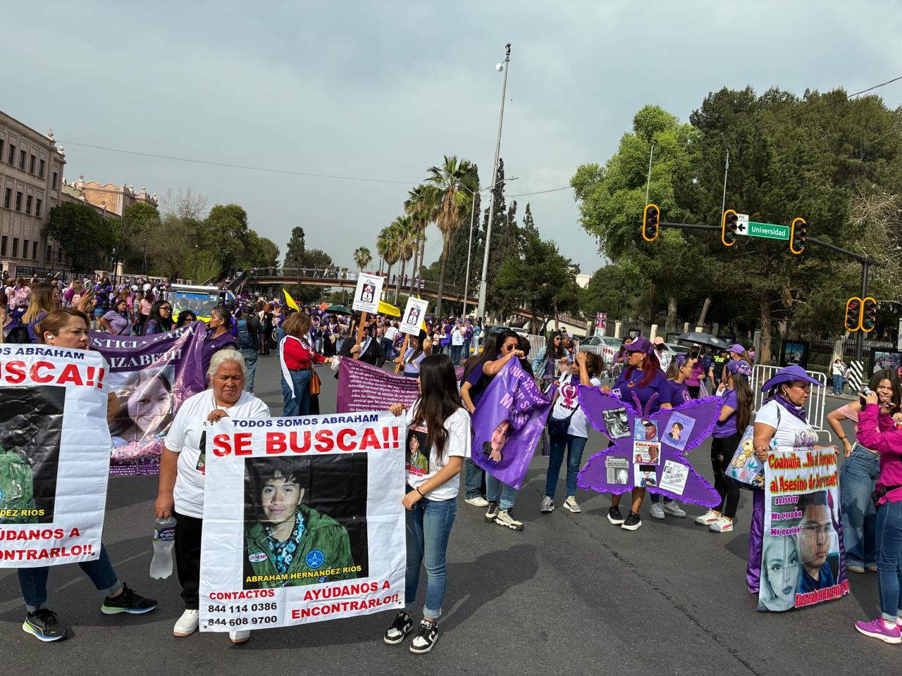 La movilización inició en el cruce de avenida Universidad y el bulevar Venustiano Carranza, desde donde los contingentes avanzaron hacia el Centro de la ciudad entre consignas y pancartas que denunciaban la violencia de género y reclamaban atención a los casos de mujeres asesinadas o desaparecidas.