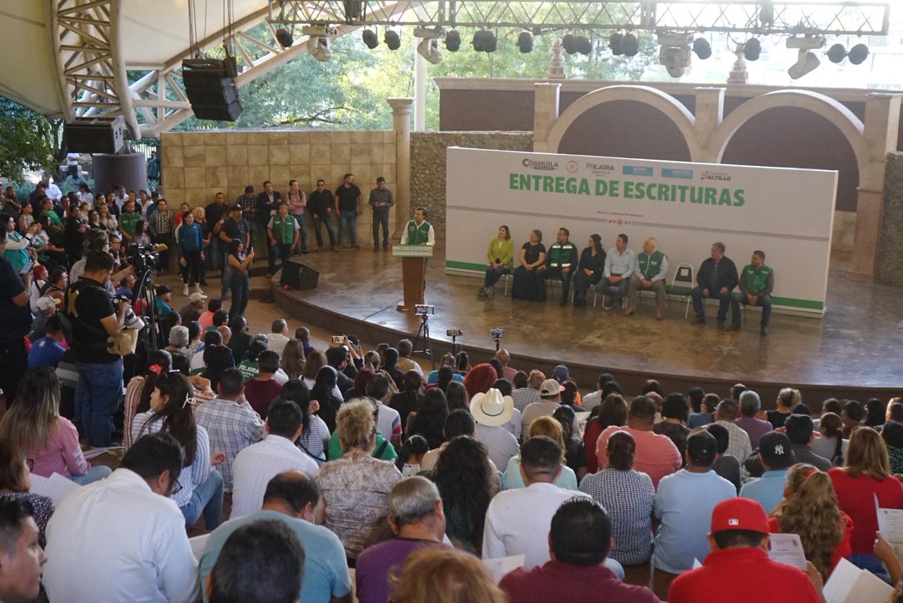 Saltillo, Coah.- El Gobierno del Estado, a través de los programas Mejora Coahuila, CERTTURC y la Secretaría de Vivienda y Ordenamiento Territorial, realizó ayer la entrega de más de 700 escrituras a familias de Saltillo, como parte de una estrategia estatal para brindar certeza jurídica y fortalecer el patrimonio familiar.