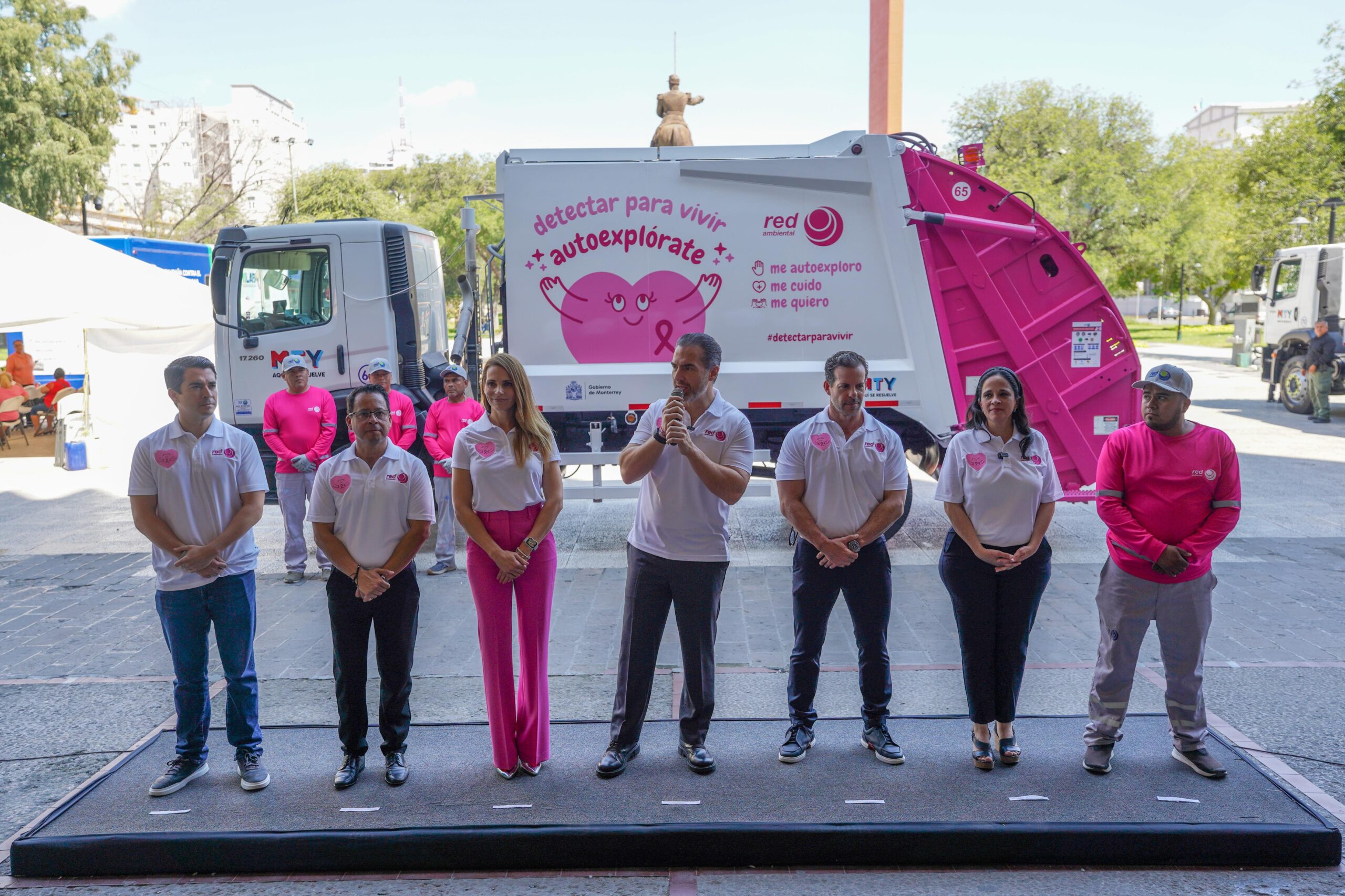 La campaña incluye la circulación de camiones de recolección pintados de rosa con el mensaje “detectar para vivir, autoexplórate”, además de cuadrillas de trabajadores que portarán uniformes del mismo color para invitar a la población femenina a realizarse estudios de autoexploración.