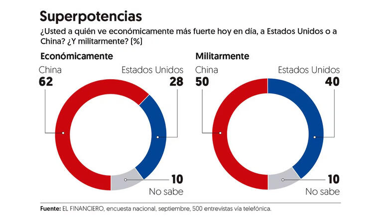 Ahora sí, ¿a quién ve usted económicamente más fuerte, a China o a Estados Unidos? De acuerdo con el sondeo, 28 por ciento respondió Estados Unidos, y una mayoría de 62 por ciento dijo que a China. Una diferencia de más de dos a uno.