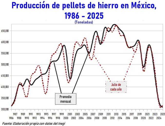 La producción de pellets de hierro, insumo para la producción de acero, en México registró en julio una reducción de 1.2%, esa reducción es una de las 27 caídas registradas en los últimos 31 meses (desde enero de 2023). Considerando sólo los meses de julio, es el segundo nivel más bajo en los últimos 39 años; en el periodo enero-julio de cada año, es el más bajo en la historia y considerando la producción promedio mensual, 2025 es el más bajo, según el análisis de Reportacero a los datos del Inegi.