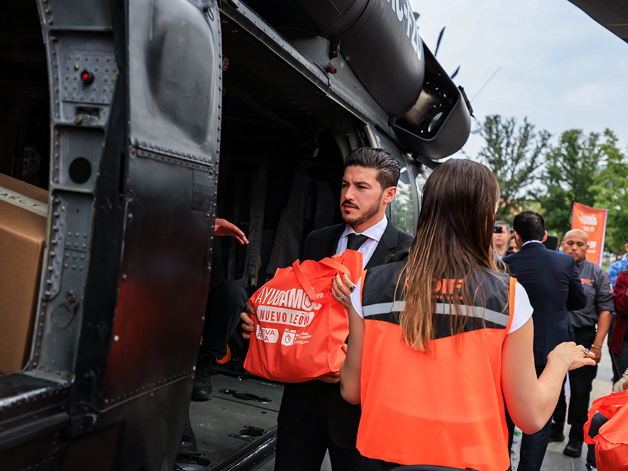 El operativo fue encabezado por el gobernador Samuel Alejandro García Sepúlveda, quien supervisó la carga de insumos en un helicóptero Black Hawk acompañado por integrantes de su gabinete estatal.