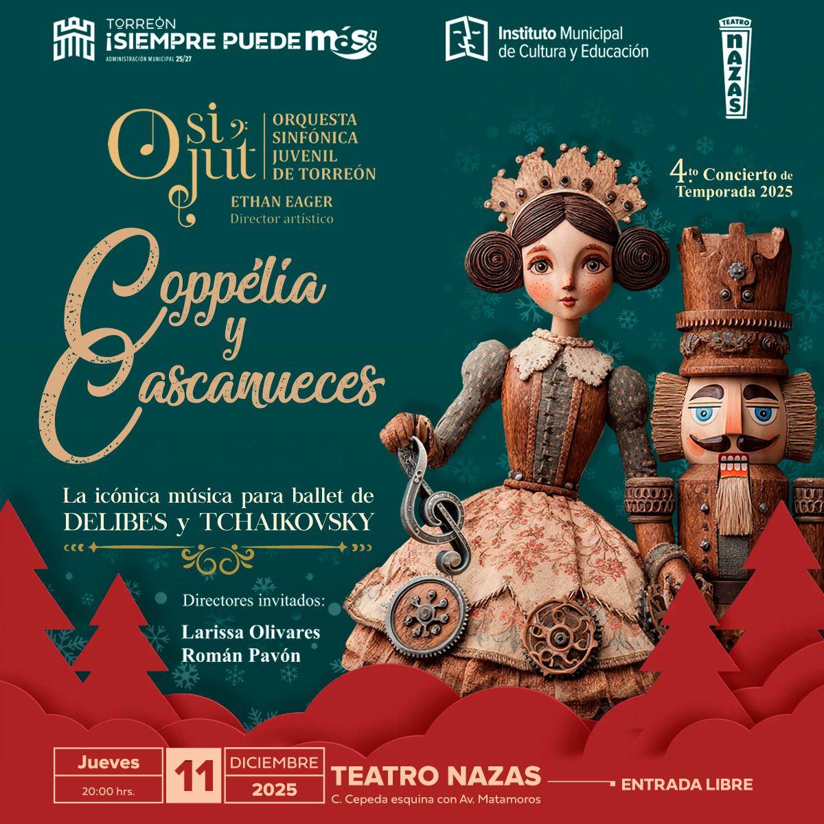 Torreón, Coah.— El Ayuntamiento de Torreón, mediante el Instituto Municipal de Cultura y Educación (IMCE), anunció la realización del cuarto concierto de temporada de la Orquesta Sinfónica Juvenil de Torreón (OSIJUT), que presentará un programa centrado en dos obras emblemáticas del ballet clásico: Coppélia, de Léo Delibes, y El Cascanueces, de Piotr I. Tchaikovsky.