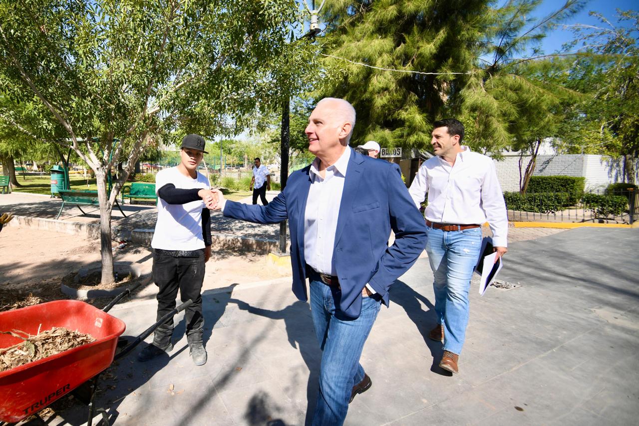 Torreón, Coah.- El alcalde Román Alberto Cepeda González realizó un recorrido de supervisión en las obras de remodelación que se llevan a cabo en la Alameda Zaragoza, con una inversión de 3.5 millones de pesos. Los trabajos incluyen la rehabilitación integral del espacio público y la instalación de un área de juegos infantiles.