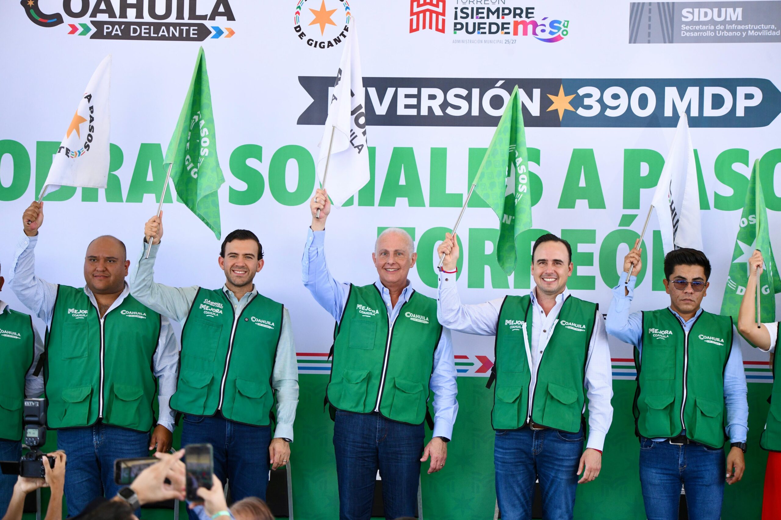 Torreón, Coah.- Con una inversión de 390 millones de pesos, el Gobierno del Estado y el Municipio de Torreón pusieron en marcha el programa de obras sociales A pasos de Gigante, que incluye trabajos de pavimentación y recarpeteo en el ejido La Joya y la colonia Quintas Los Nogales.