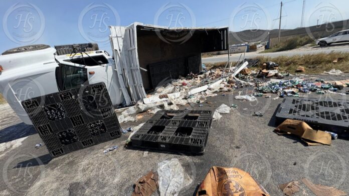 Saltillo, Coah.- La volcadura de un camión que transportaba cerveza provocó una intensa movilización la tarde de este martes sobre la carretera Saltillo–Torreón, a la altura del Relleno Sanitario, en el kilómetro 8.